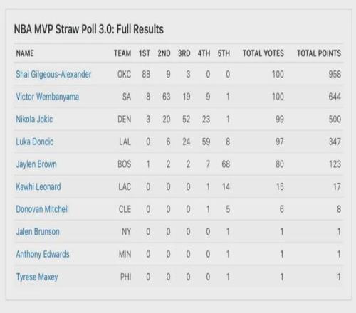 NBA官網(wǎng)的MVP排名,并不意味著最終一定會獲獎。不過今年的MVP評選,已經(jīng)成了文班和SGA的二人轉。ESPN近日邀請100位體育媒體人,對常規(guī)賽MVP進行了模擬投票:亞歷山大獲得了88張第一選票,總得分958分遙遙領先。