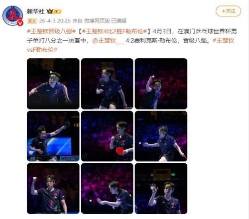 據(jù)新華社消息,4月3日,在澳門乒乓球世界杯男子單打八分之一決賽中,王楚欽 4:2費利克斯·勒布倫,晉級八強。