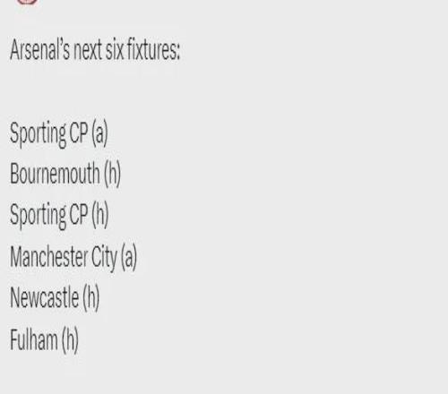 阿森納未來6場比賽對手:客戰(zhàn)葡萄牙體育、主戰(zhàn)伯恩茅斯、主戰(zhàn)葡萄牙體育、客戰(zhàn)曼城、主戰(zhàn)紐卡斯?fàn)?、主?zhàn)富勒姆。