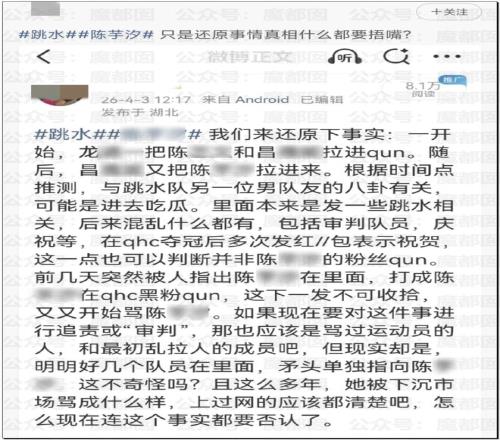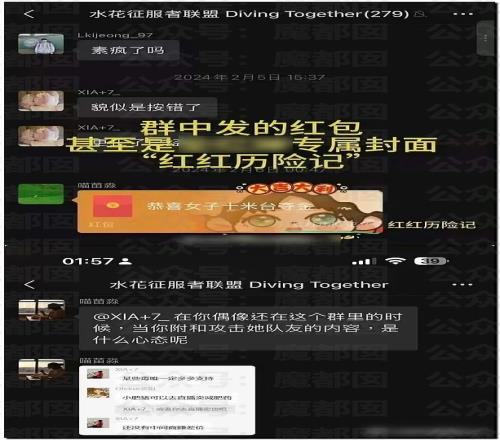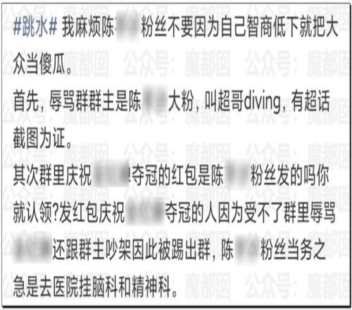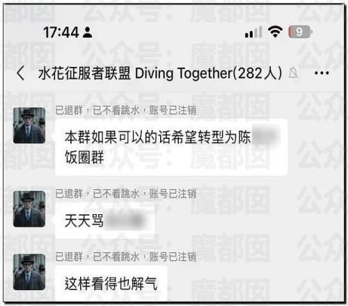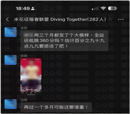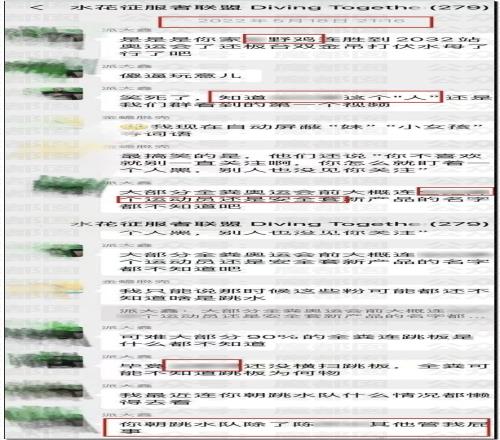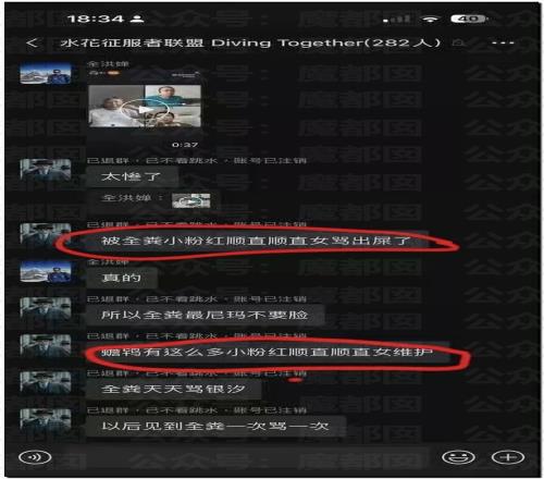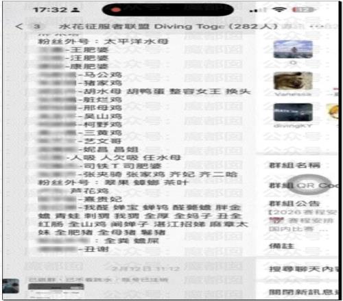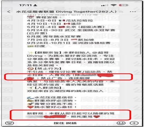 有網(wǎng)友發(fā)現(xiàn)有個名字“水花征服者聯(lián)盟”的微信群(282人)被曝光長期針對QHC進行人身攻擊。群公告明確標(biāo)注“禁止攻擊其他運動員(QHC除外)”,并默許群成員對QHC使用大量侮辱性外號(如“母豬”“肥豬”)。