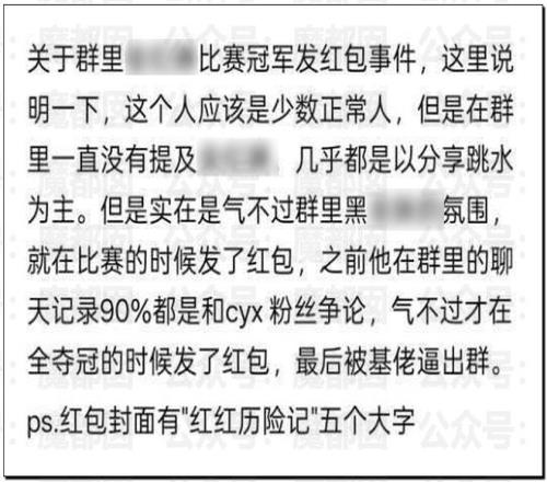 如果大家只是覺得這個是什么惡臭粉圈的行為,這個事情就不會如此發(fā)酵了,因為其中成員疑似包含CYX、CYN、CYW等現(xiàn)役冠軍選手,還有很多官媒記者和運動員。