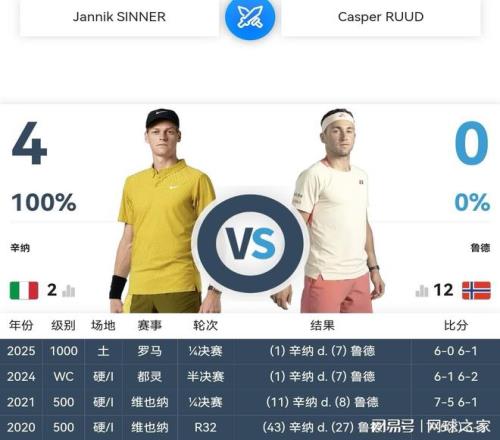 盡管職業(yè)生涯至今魯?shù)滤膽?zhàn)全負(fù)于辛納,其中去年羅馬大師賽1/4決賽,更是兩盤僅得一局,以0:6 1:6的懸殊比分慘負(fù)。但是魯?shù)录t土底蘊(yùn)深厚,紅土戰(zhàn)法諳熟于心,辛納要想再次過(guò)關(guān),并非易事。