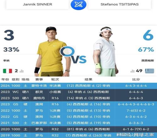 本周蒙特卡洛大師賽,辛納奪冠道路荊棘密布,步步艱辛。首輪輪空之后,辛納第二輪首戰(zhàn)法國(guó)左手將安貝爾,應(yīng)該過(guò)關(guān)無(wú)虞;第三輪1/8決賽可能對(duì)陣希臘海盜西西帕斯,難度急劇上升。西西帕斯雖然現(xiàn)在世界排名已經(jīng)滑落到40開外,但他曾經(jīng)三奪蒙特卡洛大師賽冠軍(2021、2022、2024年),一次闖進(jìn)法網(wǎng)決賽(2021年),乃是公認(rèn)的95后紅土頂尖高手。兩人職業(yè)生涯至今交鋒九次,西西帕斯六勝三負(fù)領(lǐng)先,其中紅土交鋒戰(zhàn)績(jī)更是四勝一負(fù)領(lǐng)先。2024年蒙特卡洛大師賽半決賽,正是西西帕斯三盤戰(zhàn)勝辛納,粉碎了辛納職業(yè)生涯首次闖進(jìn)紅土大師賽決賽的夢(mèng)想。