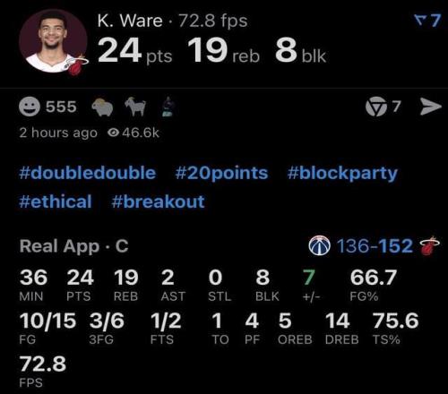 熱火新秀Kel'el Ware昨天打奇才,24分19籃板8蓋帽,準(zhǔn)三雙帶蓋帽的數(shù)據(jù)。賽后熱區(qū)Reddit吵翻了——有人翻記錄發(fā)現(xiàn),官方統(tǒng)計和現(xiàn)場播報對蓋帽數(shù)各執(zhí)一詞,7個還是8個成了羅生門。