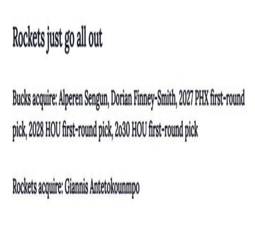 雄鹿得到:申京+芬尼史史密斯+27年太陽首輪+28年火箭首輪+30年火箭首輪。