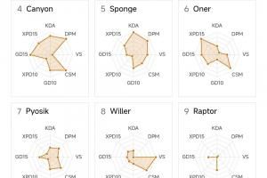 電競體育4月11報道 近日,有國外粉絲制作了4月10日前LCK聯(lián)賽的選手?jǐn)?shù)據(jù)雷達(dá)圖,其中打野位置里數(shù)據(jù)最亮眼的是BRO的打野GIDEON與Cuzz,而BFX打野Raptor的雷達(dá)圖則成了“時鐘圖”!
