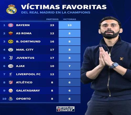 皇馬歐冠取勝場(chǎng)次最多的10個(gè)對(duì)手: