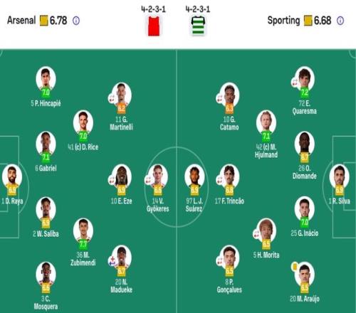 阿森納首發(fā):1-拉亞、3-莫斯克拉、2-薩利巴、6-加布里埃爾、5-因卡皮耶、41-賴斯、36-蘇比門迪、10-埃澤(79'9-熱蘇斯)、11-馬丁內(nèi)利(79'19-特羅薩德)、20-馬杜埃凱(63'56-道曼)、14-哲凱賴什(56'29-哈弗茨)