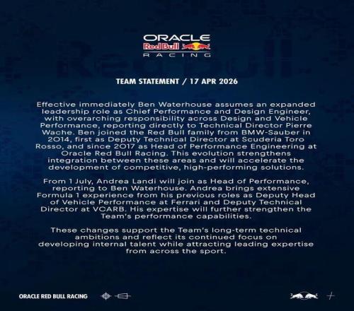與此同時,曾擔(dān)任法拉利車輛性能副主管的安德烈亞·蘭迪將于2026年7月1日起正式加盟紅牛車隊,擔(dān)任性能主管,直接向沃特豪斯匯報。
