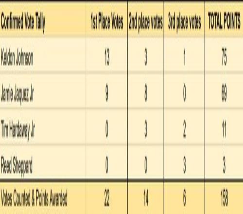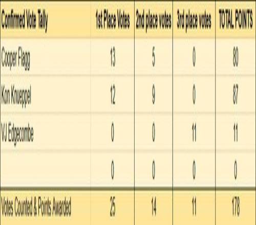 年度最佳新秀的爭(zhēng)奪很激烈,埃奇庫(kù)姆重在參與,主要爭(zhēng)奪在弗拉格和克努佩爾之間進(jìn)行。已經(jīng)揭曉的25位投票者,13張第一選票屬于弗拉格,12張第一選票屬于克努佩爾,但票數(shù)轉(zhuǎn)換成積分卻是克努佩爾87-80暫時(shí)領(lǐng)先,因?yàn)樗玫搅烁嗟牡诙x票。