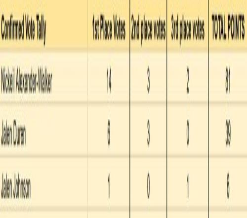 進(jìn)步最快球員,目前占據(jù)優(yōu)勢(shì)的是亞歷山大-沃克。已公布的21人投票中,有14人把他放在第一選票的位置上,領(lǐng)先杜倫的優(yōu)勢(shì)比較明顯。
