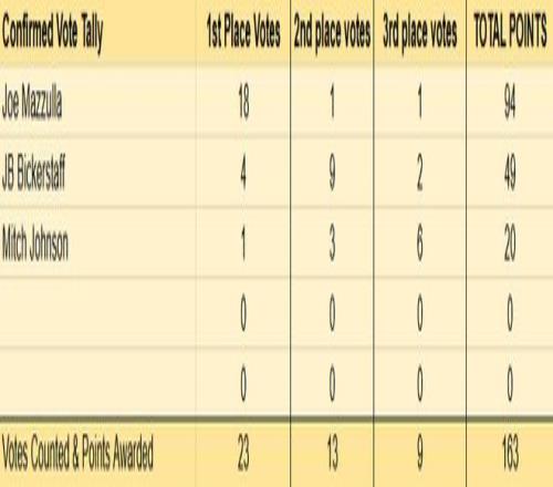 至于最佳教練,馬祖拉的優(yōu)勢(shì)明顯。已經(jīng)揭曉的23位投票者,馬祖拉得到18張第一選票,比克斯塔夫得到4張,米奇-約翰遜得到1張。雖然比克斯塔夫已經(jīng)斬獲教練協(xié)會(huì)頒發(fā)的最佳教練獎(jiǎng),但NBA官方的最佳教練獎(jiǎng)?lì)A(yù)計(jì)屬于馬祖拉。