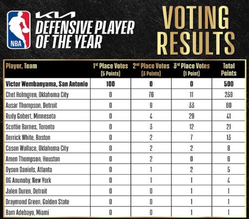 來(lái)自NBA官方的消息,馬刺隊(duì)中鋒文班亞馬當(dāng)選本賽季常規(guī)賽DPOY!三位常規(guī)賽DPOY終極候選人的得票具體情況如下:文班亞馬拿到了所有的100張第一選票,總得分為500分;切特拿到76張第二選票和11張第三選票,總得分為239分;奧薩爾湯普森拿到9張第二選票和33張第三選票,總得分僅為67分。值得一提的是,森林狼隊(duì)的戈貝爾(41分)、猛龍隊(duì)的巴恩斯(21分)、綠軍的懷特(13分)、雷霆隊(duì)的華萊士(8分)、火箭隊(duì)的阿門(6分)、老鷹隊(duì)的丹尼爾斯(5分)、尼克斯隊(duì)的阿奴諾比(4分)、熱火隊(duì)的阿德巴約(1分)、勇士隊(duì)的格林(1分)、活塞隊(duì)杜倫(1分)瓜分了剩余15張第二選票和56張第三選票。